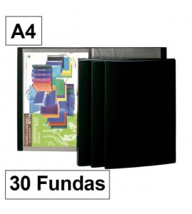 Carpeta 30 fundas A4 Negras sin lomo. Tapas de polipropileno flexibles. Fundas transparentes de polipropileno antirreflejo y resistentes a las fotocopias. Soldadas al lomo. Color: Negro.