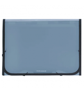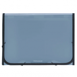 Carpeta clasificadora fabricada en polipropileno. Con doce separadores. Con goma. Color: Azul grisáceo. Traslúcida.